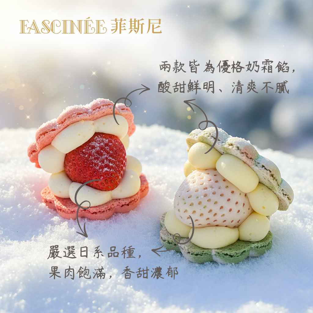 精心手工製作的雪焰草莓馬卡龍薈萃最新鮮的紅/白草莓濃郁香氣與優格乳酪奶霜美好滋味寵愛您挑剔的味蕾。